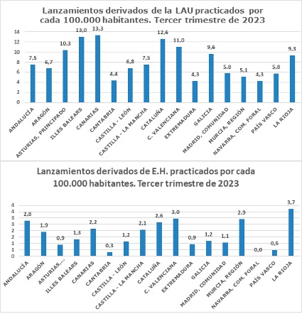 El número de lanzamientos practicados durante los pasados meses de julio, agosto y septiembre ascendió a 5.474, un 26 % menor que el registrado en el mismo periodo de 2022. El 76,3 % de los lanzamientos (4.178) fue consecuencia de procedimientos derivados de la Ley de Arrendamientos Urbanos (LAU), mientras que el 17,6 % restante (963) se derivó de ejecuciones hipotecarias. Otros 333 lanzamientos practicados en el periodo analizado obedecieron a otras causas.